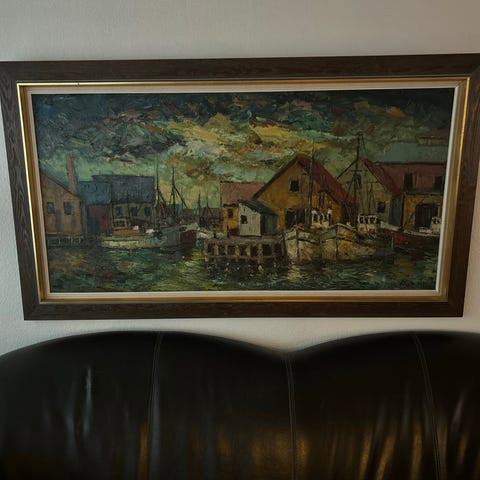 Oliemaleri, Finn Andersen, b: 65 h: 55, Havneparti ved kysten. Olie på lærred, signeret Finn An. Rammemål 79x69. Maleri i god stand i flot ramme. Gerne besked med sms, evt. forsendelse + porto.