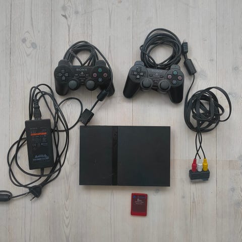 Playstation 2 med 2 controllere, memory card og HDMI omformer.
