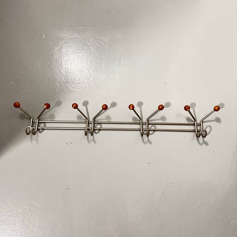 IKEA knagerække i hvidmalet materiale med fem messingfarvede knager. Knagerækken har en overliggende stang, der kan bruges til ophæng af bøjler eller tørrestang. Egnet til entré, soveværelse eller badeværelse til ophæng af tøj, jakker, tasker eller håndklæder. Designet til vægmontering. Oplysninger om præcise mål og materiale er 66 cm bred.
