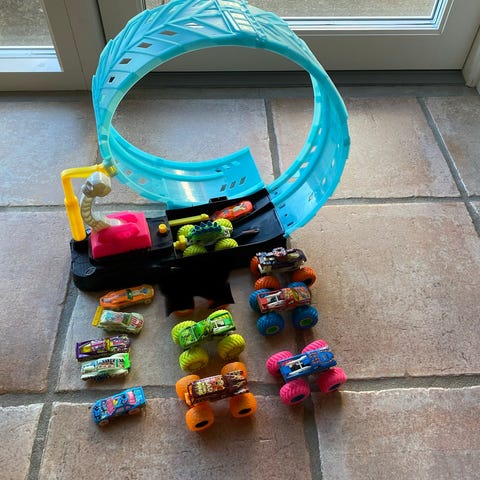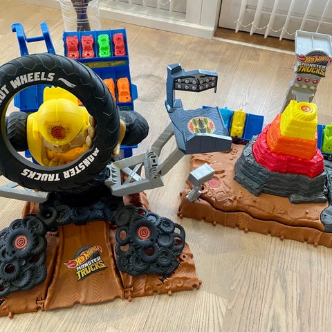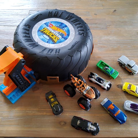 Hot Wheels Monster Trucks legesæt med flere banedele og køretøjer. Sættet består af en farverig plastiklegebane med ramper, loop og forskellige forhindringer samt flere Hot Wheels biler og monster trucks i metal og plastik. Egnet til leg med småbiler og monster trucks, hvor børn kan køre bilerne ned ad ramperne, gennem loopet og parkere dem i de integrerede opbevaringsrum. Velegnet til indendørs brug på gulv eller bord.
