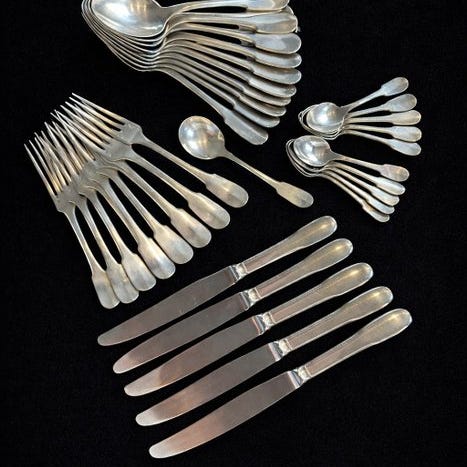 Forskellige "pletsølv" bestik Knive, gafler, skeer, teskeer, spiseskeer og sovseske.