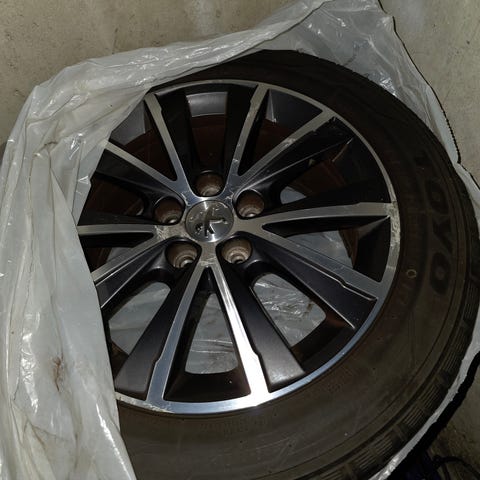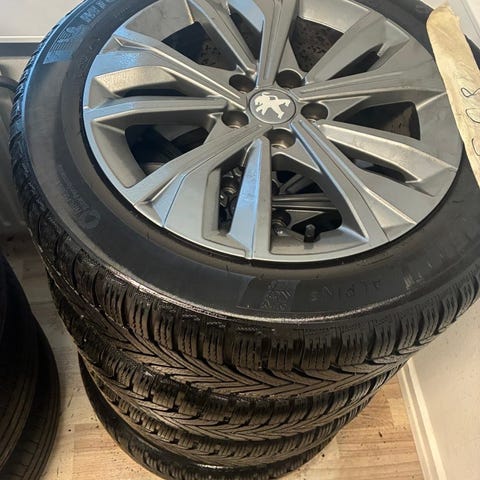 Det sidder slidte 215/65 R17 Michelin Alpin 5 vinterdæk på, kørte på dem sidste vinter (ca. 3mm).
