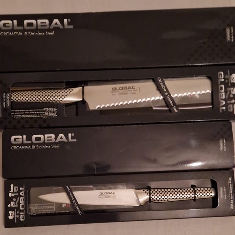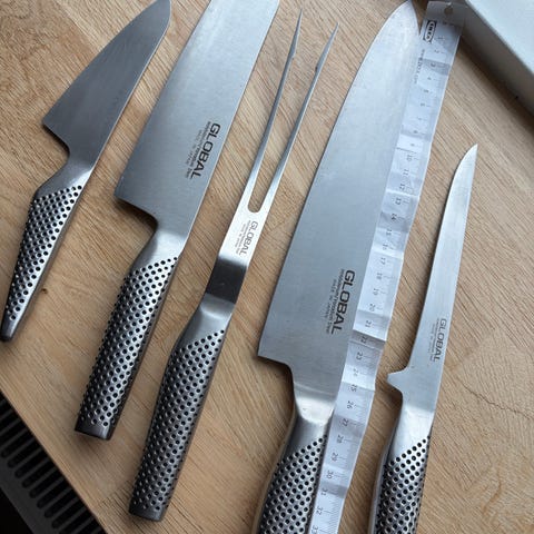 Global knivsæt i rustfrit stål. Sættet består af flere køkkenknive og en stegegaffel med karakteristiske prikkede stålhåndtag. Knivene egner sig til forskellige opgaver i køkkenet, herunder udskæring, hakning og filetering. Alle dele er udført i metal med integrerede håndtag for et ensartet udtryk.
