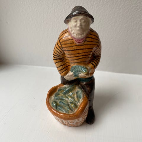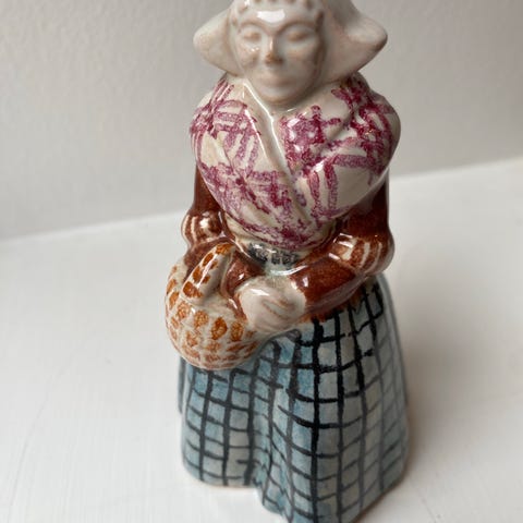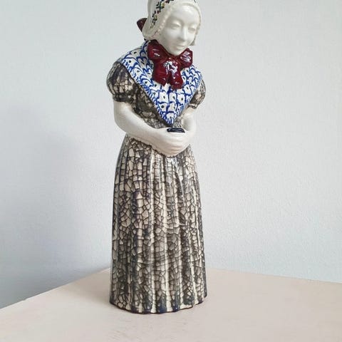 Bing & Grøndahl figur i keramik, formet som pige i folkedragt fra Bornholm. Figuren er flerfarvet med rosa nederdel, grøn jakke og tørklæde/hue i lyse nuancer. Undersiden er mærket med Danmark, formnummer 5369 og skjoldstempel.