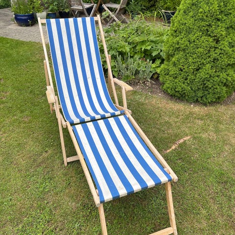 Liggestol i træ med grå polstret tekstilsæde. Stolen har justerbar ryglænsvinkel og sammenklappeligt stel, som gør den velegnet til brug på terrasse, altan eller i haven. Trærammen fremstår med varm træfinish, og sædet er opdelt i polstrede sektioner for øget komfort.