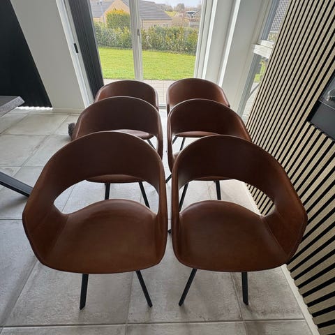 6 spisebordsstole fra Ilva i sort plastskal og sorte træben sælges. Der er lidt mærker i kunstlæderet og almindelige brugsspor.