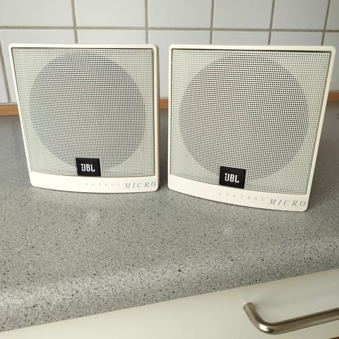 JBL højtalere i sølvfarve. Kompakt sæt med to passive højtalere med frontgitter i metal og bagtil terminaler til højtalerkabel. Velegnet som stereohøjtalere til anlæg eller som surround-/baghøjtalere i et hjemmebio-setup. Kan placeres på hylde eller stativ afhængigt af behov.