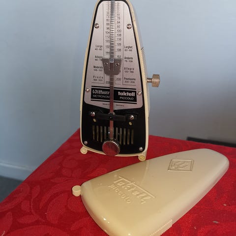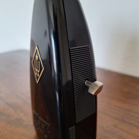 Wittler Taktell - mekanisk metronom - original fra 1960’erne. Jeg har nok fået den i 1969. Lysegrå plastikkasse - fungerer stadig perfekt