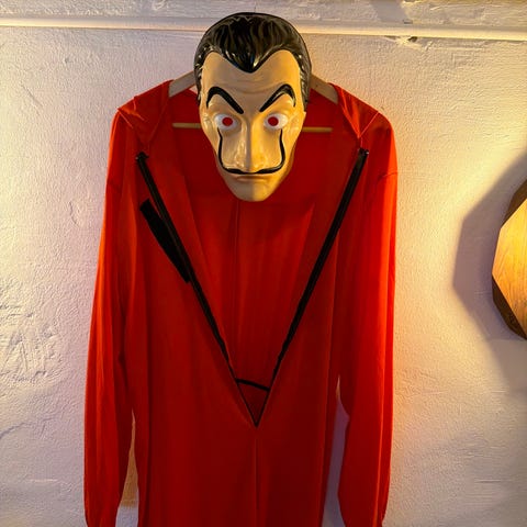 Kostume bestående af rød heldragt med hætte og tilhørende maske. Masken er hård og dækker hele ansigtet, med åbninger til øjne, næse og mund. Øjnene er selv klippet ud og der kommet en flænge i den.