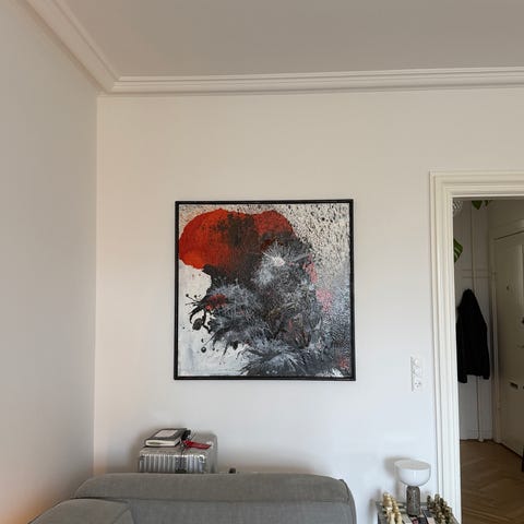 Maleri på kvadratisk lærred af Lars Larsen. Værket viser et figurativt motiv med en person i centrum og teksten “Horny Dog” på grå/blå baggrund. 63 bredde og 63 længde.