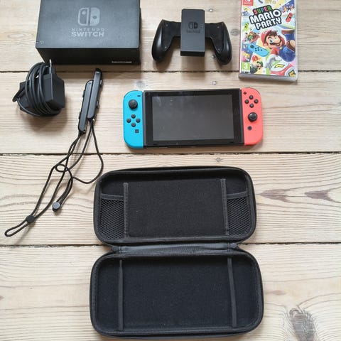 Nintendo Switch konsol neon rød/blå med spil og taske