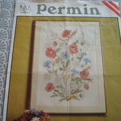 Mønster, PUDE * PERMIN-model * 87-5287, Originalt Vintage Mønster - VILDE BLOMSTER - (1950'erne) - Garnfarvekode - Instrukser - Korssting - I fin stand!