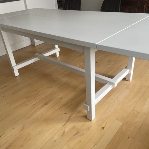 Bordet er i rigtig fin stand, men har et lille hak på den ene langside. Det er ikke noget man lægger mærke til ved normal brug. Der medfølger også en spray med laminatrens, som kan bruges til let at rense overfladen hvis der kommer mærker.