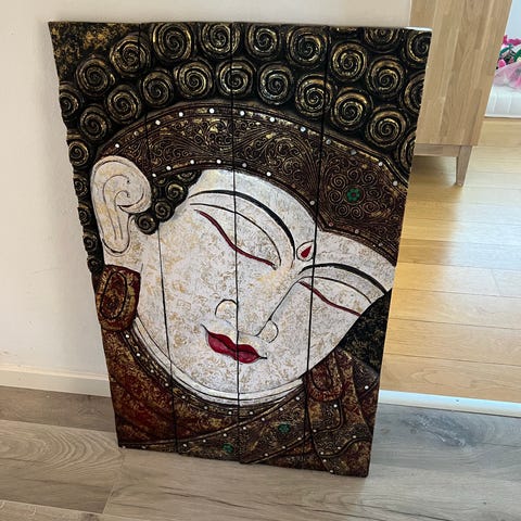 Buddha vægmaleri i sort/hvid med motiv af Buddha-ansigt i front. Maleriet har dekorative mønstre og tegn i baggrunden og er udført i dæmpede, neutrale nuancer, som egner sig til ophængning i stue, soveværelse eller andre opholdsrum.