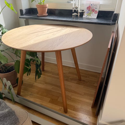 Bordpladen er olieret, har mindre mærker (både tusch og mindre “huller”, se billeder for eksempel), men kan slibes og efterbehandles. Bordet har været elsket af både børn og voksne.