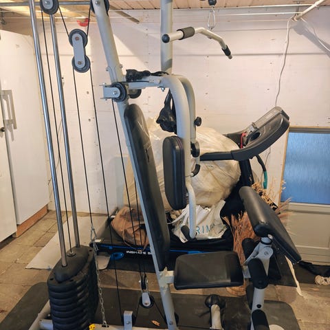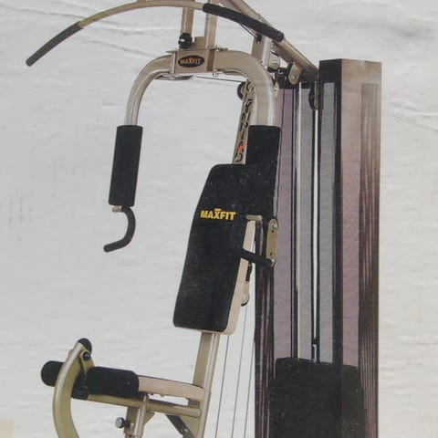 Maxfit multitræningsstation hjemmetræner i sort. Træningsstationen har polstret sæde og rygstøtte samt flere træningsarme og kabeltræk til forskellige styrkeøvelser. Velegnet til helkropstræning i hjemmet med mulighed for blandt andet brystpres, lat pulldown, benstræk og andre basisøvelser. Konstruktionen er i metal med vægtstak bagtil og justerbare indstillinger på sæde og arme for tilpasning til brugeren.