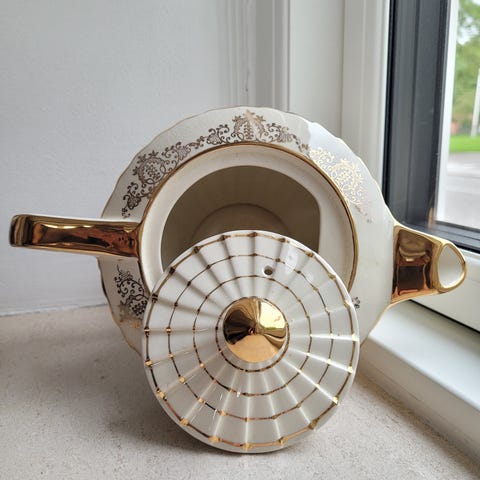 Sadler-porcelæn tekande med gulddekoration og motiv