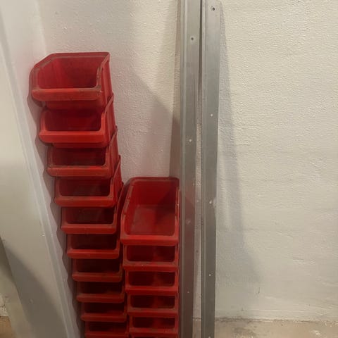Stabelbare metalkasser i grønmalet metal. Kasserne har frontåbning og præget felt til mærkning på forsiden. Velegnet til opbevaring i værksted, garage eller lignende. Flere kasser stablet oven på hinanden som en samlet enhed.