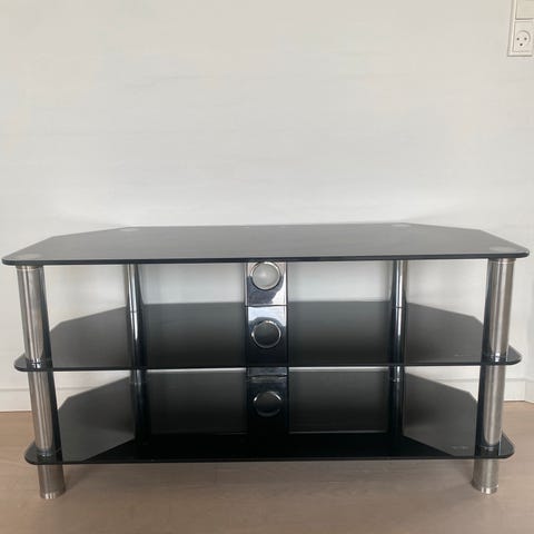 Tv møbel, TV bord i gråt metal, med 3 glas hylder.