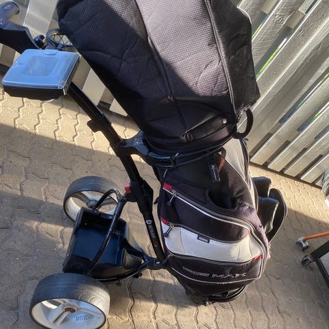 Motocaddy elektrisk golfvogn med batteri og tre hjul. Vognen har sammenklappeligt stel i metal med håndtag og kontrolpanel til styring af hastighed. Batteriet er placeret centralt på stellet og er aftageligt. Forhjulet er enkelt, mens baghjulene er større for stabilitet under kørsel på banen.