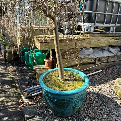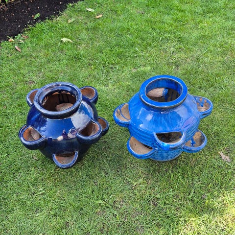 Firkantet krukke i blå glasur, velegnet til udendørs brug på terrasse, altan eller i have. Krukken har god dybde og bred åbning, som giver plads til større planter eller mindre buske. Overfladen er glaseret udvendigt og rå indvendigt, hvilket gør den egnet til beplantning med jord og dræn i bunden. Passer godt til prydplanter, krydderurter eller mindre træer, afhængigt af den konkrete størrelse.