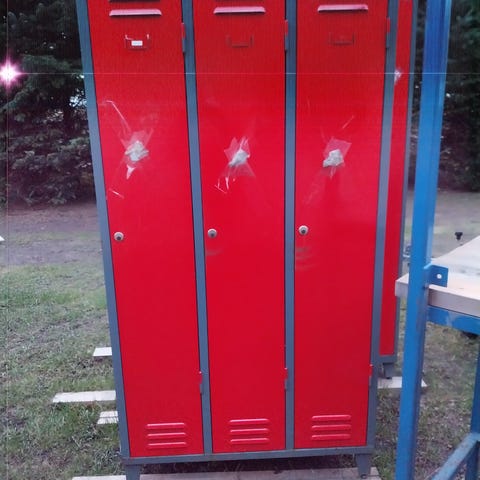 Metalskabe i grå. 3’er + 2’er (sælges helst sammen). Omklædningsskabe med mulighed for at låse med hængelås. Bredden 65,5 for 2’er skab. 96,5 cm. For 3’er skabet. Samlet 162 cm.