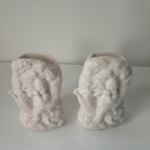2 Art Deco vaser, 2 smukke Art Deco vaser, højde 13 cm. Den lille lyseholder er gammel og er til lys mindre i diameter end juletræslys. Lyseholderen måler 7,5 cm. Den koster 12kr. Hver vase koster 39kr og sælges kun samlet til 75kr. Med nr i bunden/se sidste billede.