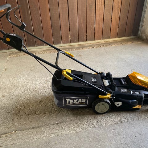 Meget pæn og velholdt Texas batteri plæneklipper. Meget lidt brugt. Sælges UDEN batterier. Den er til Texas 20 volt batterier. Nye batterier og oplader kan købes til omkring 900-1200 kr alt efter ampere timer.