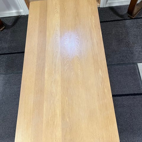 Shakerbordplade i egetræsfiner. Der er en lille skade på egetræet i det ene hjørne af bordpladen - se billedet. OBS: Det er kun bordplade.