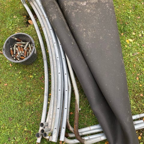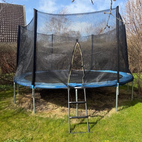 Stor havetrampolin med sikkerhedsnet, faldpude i kant og klar til montering.