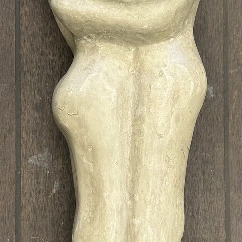 Buste skulptur i beton med høj, konisk hovedbeklædning. Figuren er udformet som et hoved på sokkel og står på et rektangulært fundament. Skulpturen har en glat forside med markerede ansigtstræk og en mere rå, ujævn bagside.