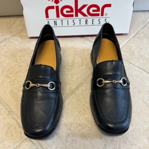 Rieker loafers i sort skind i størrelse 40. Skoene har Antistress-sål med mønstret ydersål. Overmateriale og dæksål er i ægte skind. Nypris 650,.