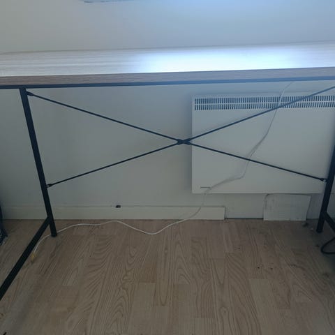 Enkelt sort skrivebord. Understel i sort metal og bordpladen er i sort træ. Har stort set ikke været brugt, fremstår derfor som nyt.