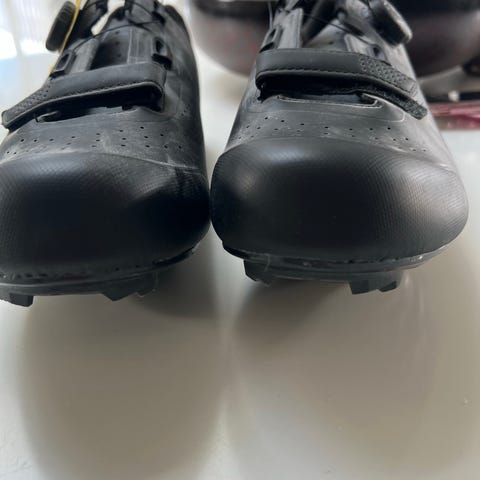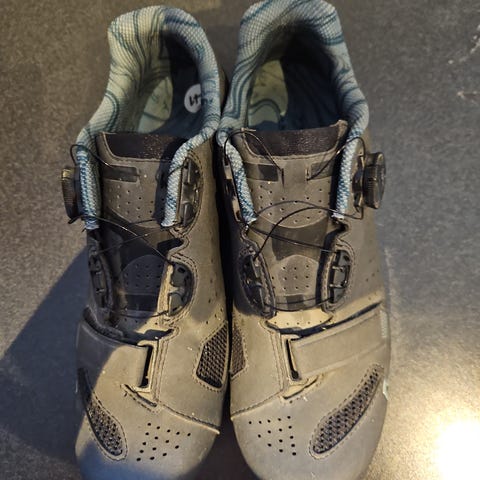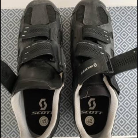 Scott cykelsko i størrelse 37. Skoene er sorte med hvide detaljer og har lukning med tre velcroremme. Modellen er egnet til klikpedaler og har kraftig, mønstret sål, som giver godt greb ved gang. Overdelen er lavet i syntetisk materiale med mesh-felter for ventilation. Velegnet til cykling, f.eks. mountainbike/ MTB eller pendling, hvor der bruges kliksko.