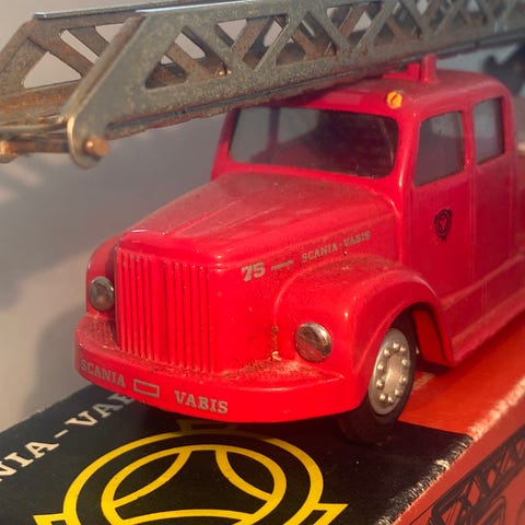 Zonens redningskorps stigevogn / triangel brandbil modelbil i metal. Modellen er rød med sort undervogn og løse gummihjul. Den tilhørende metalsstige med gitterkonstruktion medfølger separat.