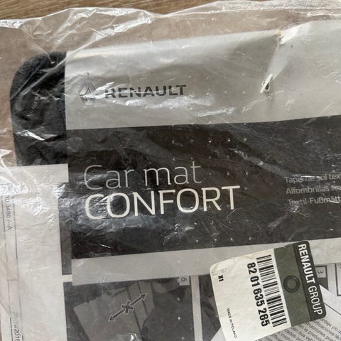 Renault Scenic E-tech bilmåtter sæt i grå tekstil. Sættet består af flere måtter, formskåret til bilens gulv. Måtterne er udført i tæppe/tekstilmateriale med kantbånd og udskæringer til fastgørelsespunkter, hvor dette er relevant. Velegnet som gulvbeskyttelse i kabinen på en Renault personbil. Nærmere modeltilpasning og mål bør kontrolleres i forhold til den konkrete bilmodel.
