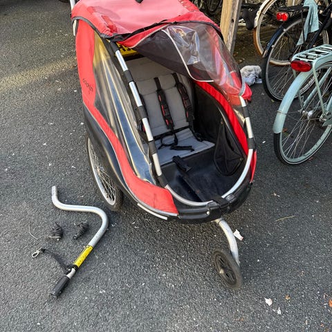 Cykelanhænger til børn i rød farve med plads til to børn. Anhængeren har sele-system i sæderne og et lille forhjul, så den også kan bruges som barnevognslignende vogn ved gang. Store hjul bagtil giver stabilitet under kørsel. Velegnet til transport af børn på cykelture eller gåture. 400 kr