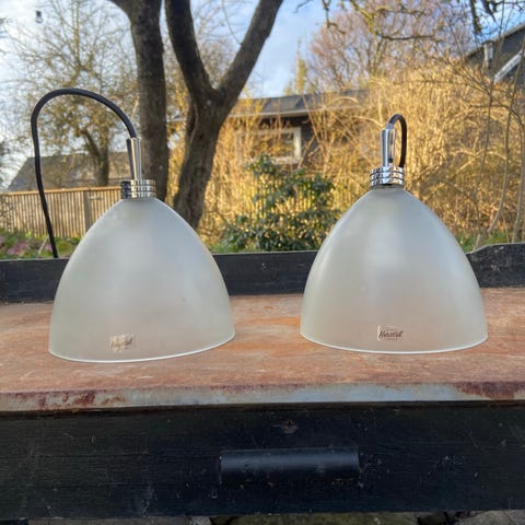 2 stk. Herstal pendler i hvidt glas. Klassisk og stilrent design, giver et blødt og behageligt lys. 13 cm i diameter. Sælges samlet.
