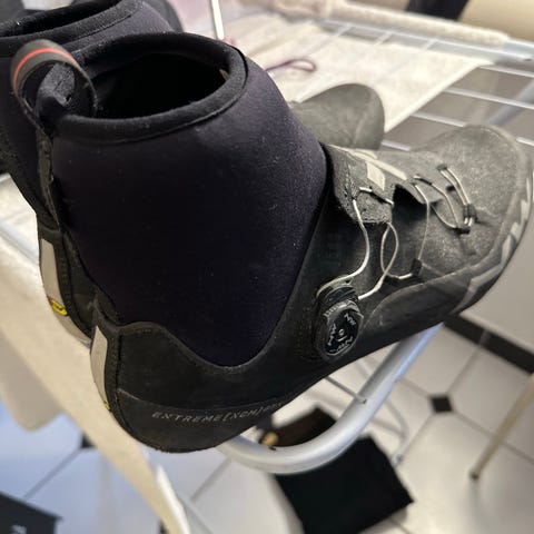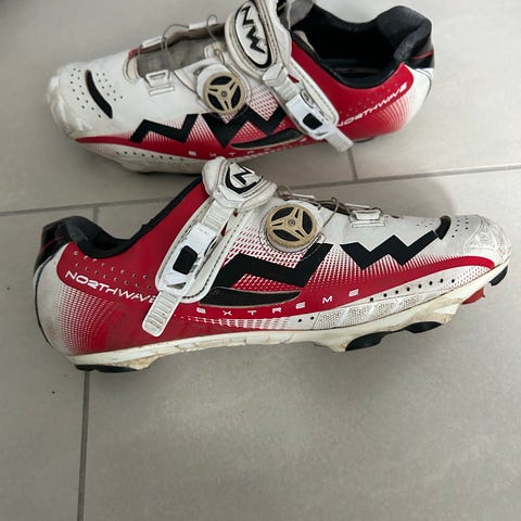 Northwave Extreme cykelsko i størrelse 43. Skoene er primært hvide og røde med sorte detaljer. De har spænde- og velcrolukning for justerbar pasform. Velegnet som cykelsko til brug med klamper på racercykel eller mountainbike, afhængigt af monteret klampesystem. Overdelen er perforeret for ventilation, og sålen er udformet til effektiv kraftoverførsel ved cykling. Anvendt til SPD.