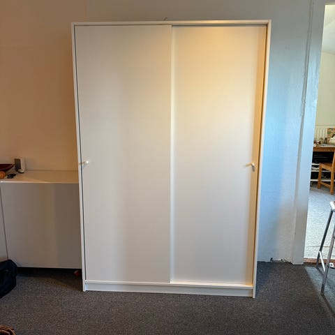 De 2 skydedører kører let på metalskinner. Skabet er med sin lille bredde perfekt til både ungdomsværelset, studieboligen eller i gæsteværelset. Skabet er ikke svært at samle, men på grund af højden, anbefales at der er 2 personer til at samle skabet.