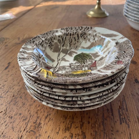 6 stk tallerkner 23cm samt lille skål 17x5 cm af stellet , Sunday morning . Er lidt krakeleret I overfladen. Samlet pris