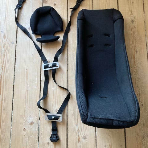 Sælger en Melia babyindsats til cykeltrailer / ladcykel inkl. sele, ekstra beslag og babypude til hovedstøtte.