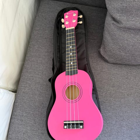 Makala ukulele i rød finish. Mindre akustisk strenginstrument med fire strenge og mekaniske stemmeskruer. Kroppen er lakeret, og stolen har motivformet design. Velegnet som begyndermodel eller til let spil i hjemmet. Ukulelen spilles akustisk uden strømtilslutning.