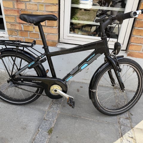 Winther pige Børnecykel med 20" hjul i pink farve med punkteret fordæk som let kan laves. Cyklen har lav indstigning, bagagebærer, kædeskærm og støtteben. Velegnet til større børn ca 5-6 år, der passer en cykel med 20" hjul. Stel og dele fremstår med synlig slitage og rust på flere steder ud fra billederne. Når dækket bliver lappet, er cyklen rigtig god at cykle på.