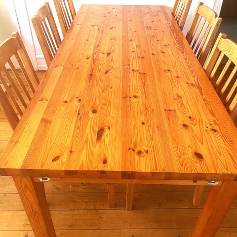 Spisebord med klapper i massiv fyrretræ, patina hist og pist, mål: L: 130 / 178,5 / 227 x B: 90 x H: 72 cm