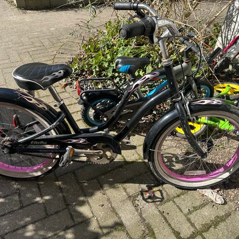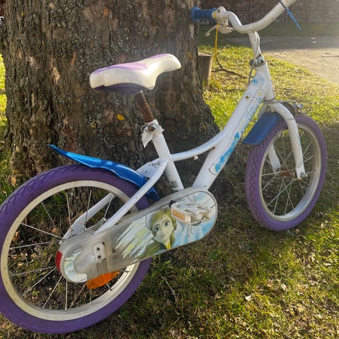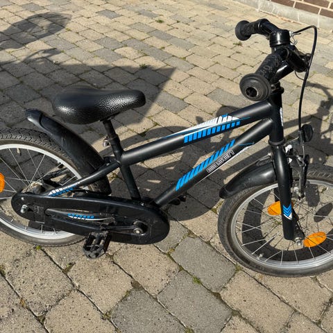 Børnecykel med 16" hjul i sort. Cyklen har lav indstigning, kædeskærm, skærme for og bag samt støtteben. Sadel og håndtag er i brun farve. Velegnet til mindre børn, der skal lære at cykle eller bruge cyklen til hverdagsture. Inkl Støtteben, ringeklokke bremse. Har stået inde altid!