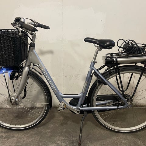 Elektrisk damecykel med 50 cm stel og 28" hjul. Cyklen har lav indstigning og er udstyret med kurv foran samt bagagebærer med kurv bagpå. Den er udført i sort stel med klassisk bycykel-geometri, egnet til kvinde. Velegnet til daglig transport i byen med opret kørestilling og god oversigt i trafikken. Cyklen har støtteben, kædeskærm og skærme for og bag. Batteri og motor er placeret ved baghjulet, hvilket giver en stabil køreoplevelse på asfalt og cykelstier.