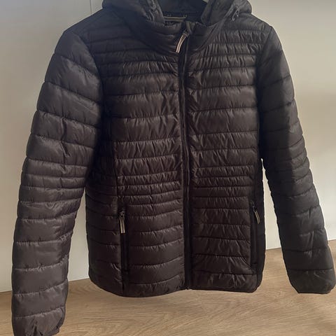 Quiltet jakke (kan også bruges som ridejakke) med flotte detaljer og bælte. Størrelsen er mest som en 38. Dejligt varmt for og praktiske lommer.