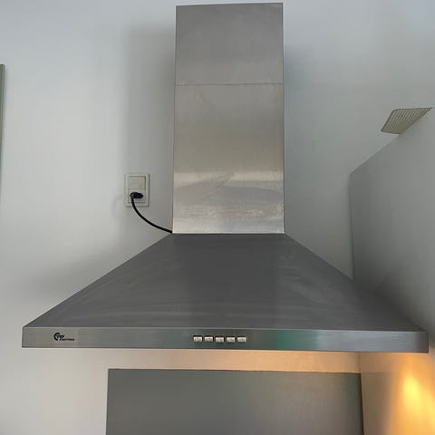 Emhætte til vægmontering i rustfrit stål med buet glasfront. Modellen har frontbetjening med trykknapper og integreret belysning under emfanget. Skorstenen er i rustfrit stål og dækker aftræksrøret op mod loftet. Velegnet til montering over komfur eller kogeplade i køkken.