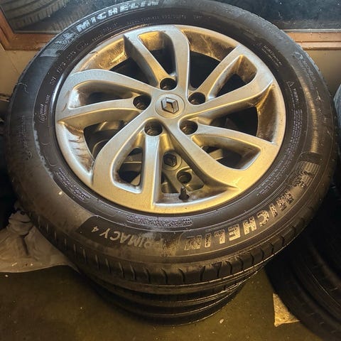 Originale Renault aluminiumsfælge med næsten nye sommerdæk. De har siddet på bilen en halv sæson sidste sommer.